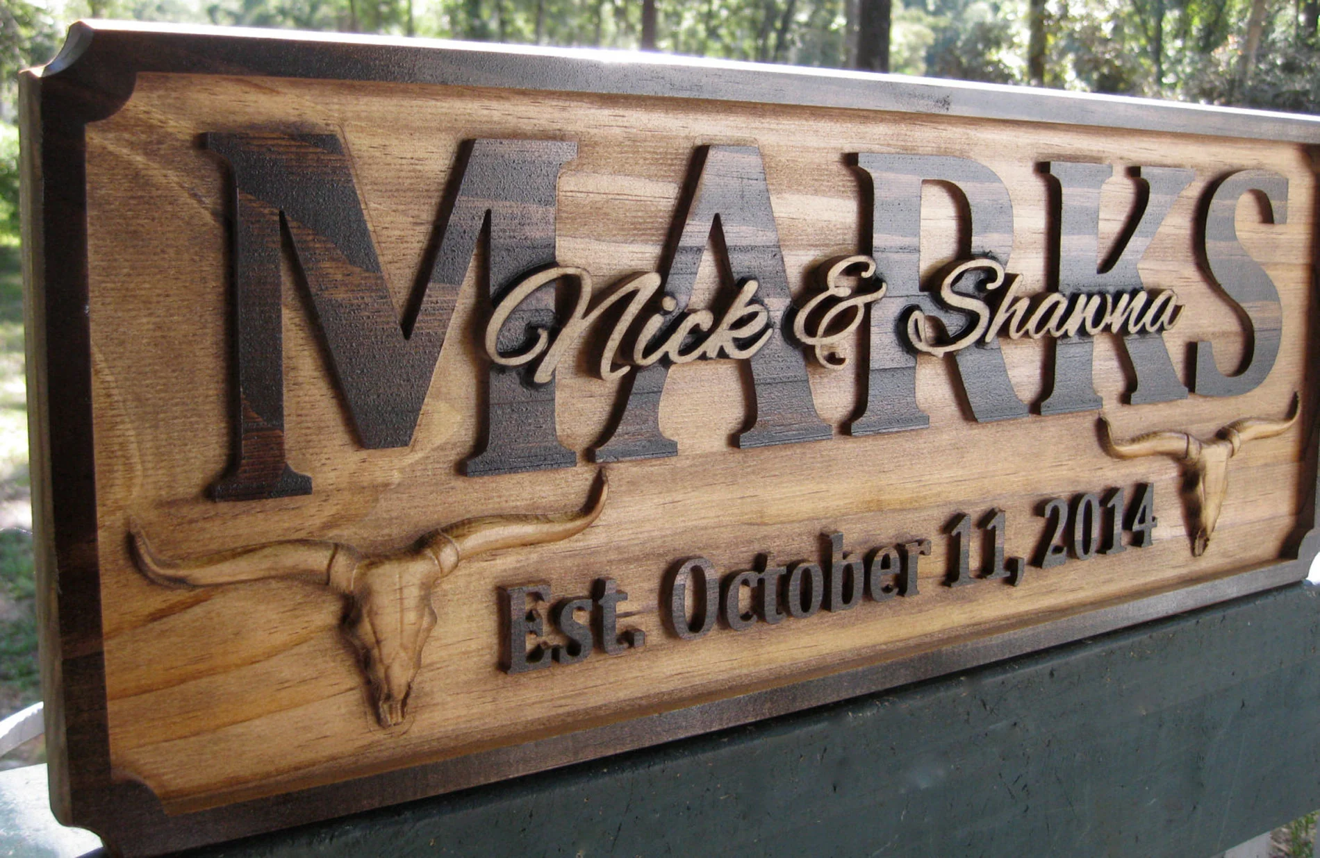 - Wood type: Solid Select Pine (for indoors) or Select Cedar (for outdoors) – Pine wood is not intended to be displayed in constant direct sunlight, rain or other harsh conditions, so select cedar if you want this outdoors.